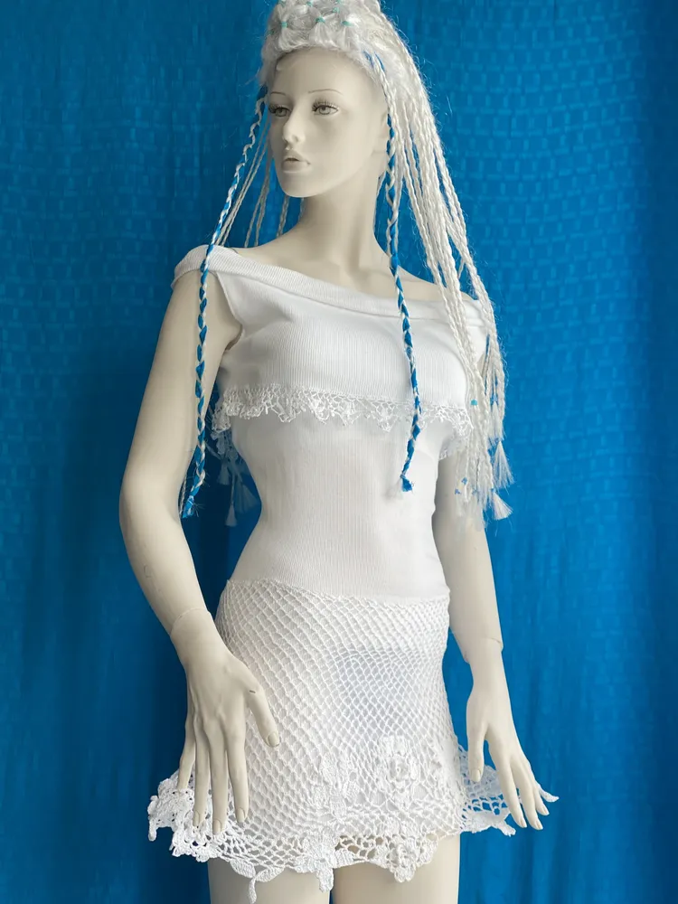 A magical look, feminine, playful, seductive, boho look, with elaborately crocheted lace, unique piece